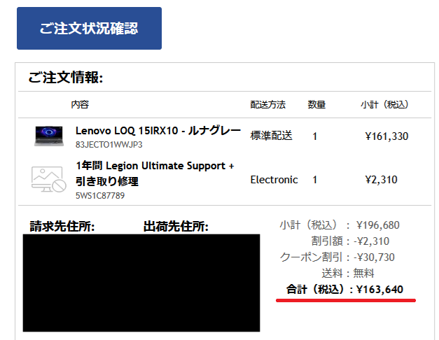 購入時はブラックフライデー前後で安売りしていたため163640円で購入できた。