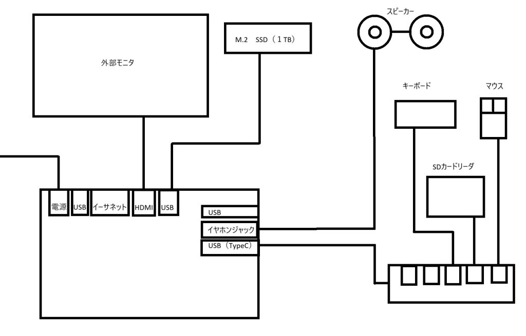 デスクトップPCで使用していた、モニタ・キーボード・マウス・SDカードリーダー・SSDを使用していたので使えるようにしていく。